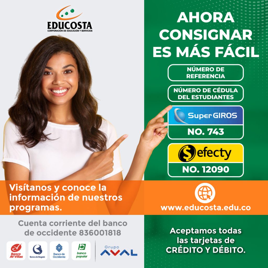 - Consignación cuenta corriente 836-001818, banco de occidente, corporación de educación y servicios EDUCOSTA.
